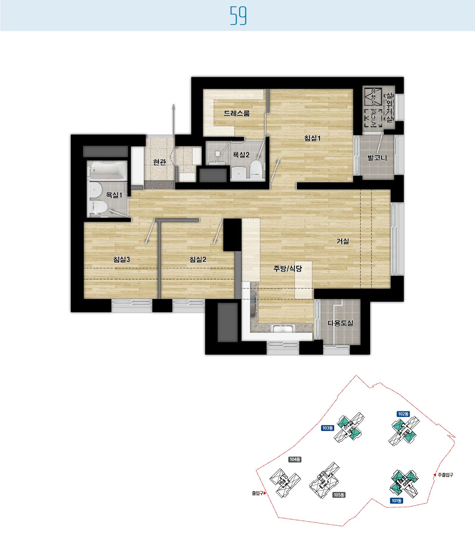 모두 전용면적 59m2인 소형 평형으로 지어진다. 아래 평면도는 참고용으로만 보자. 사전청약이라 확정된 구조나 평면이 아니다.