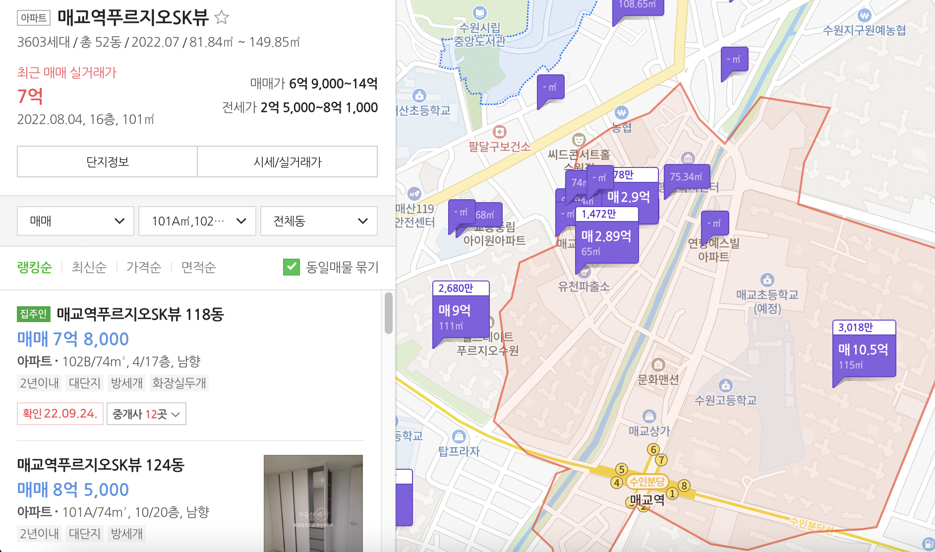 주변 매교역 푸르지오 SK뷰 실거래가와 호가를 살펴보면 지난 달 7억원에 실거래가가 찍힌 이력이 있습니다. 호가는 7.8~8.5억원 사이. 보수적으로 실거래가 기준으로 보아도 74타입은 최소 2억원의 안전마진이 있는 걸 알 수 있습니다.